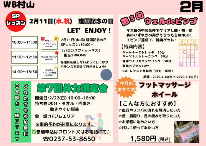 2月もウェルベース村山で皆さんの健康づくり・身体づくりサポートさせて頂きます。スタッフ一同心よりお待ちしております。体験や施設見学ご希望の方は店舗までご連絡ください!!